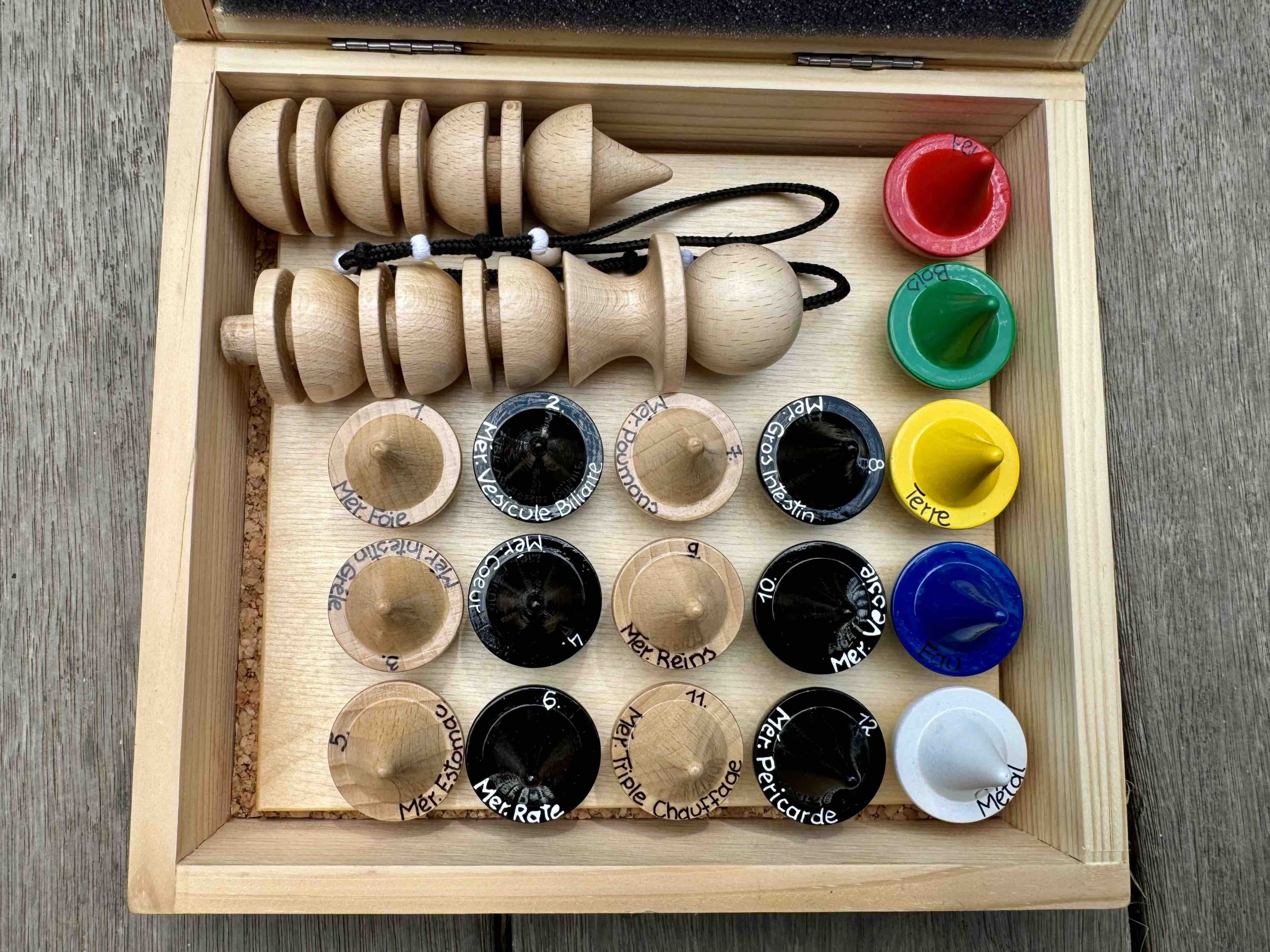 Un ensemble de 12 têtes de résonateur « Qi-Bo » (nom donné au mythologique docteur chinois de l’Empereur Jaune) qui sont porteuses de signatures vibratoires pour les 12 méridiens.