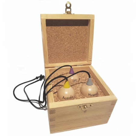 Ce sont trois pendules avec effet amélioré qui sont remplis de produits, c’est à dire de vitamine C d’Acérola (pendule Vitamina C), de vitamine P (pendule OPC) et d’argile (pendule “Mineralerde”). Il y a un ensemble de chaque pendule dans une boîte en bois.